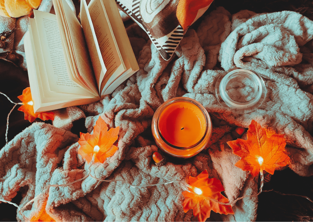 A cozy flat lay featuring a blanket, an autumnal jumper, and autumn decorations, including a pillow, faux leaf fairy lights, a candle, and a small plush pumpkin.